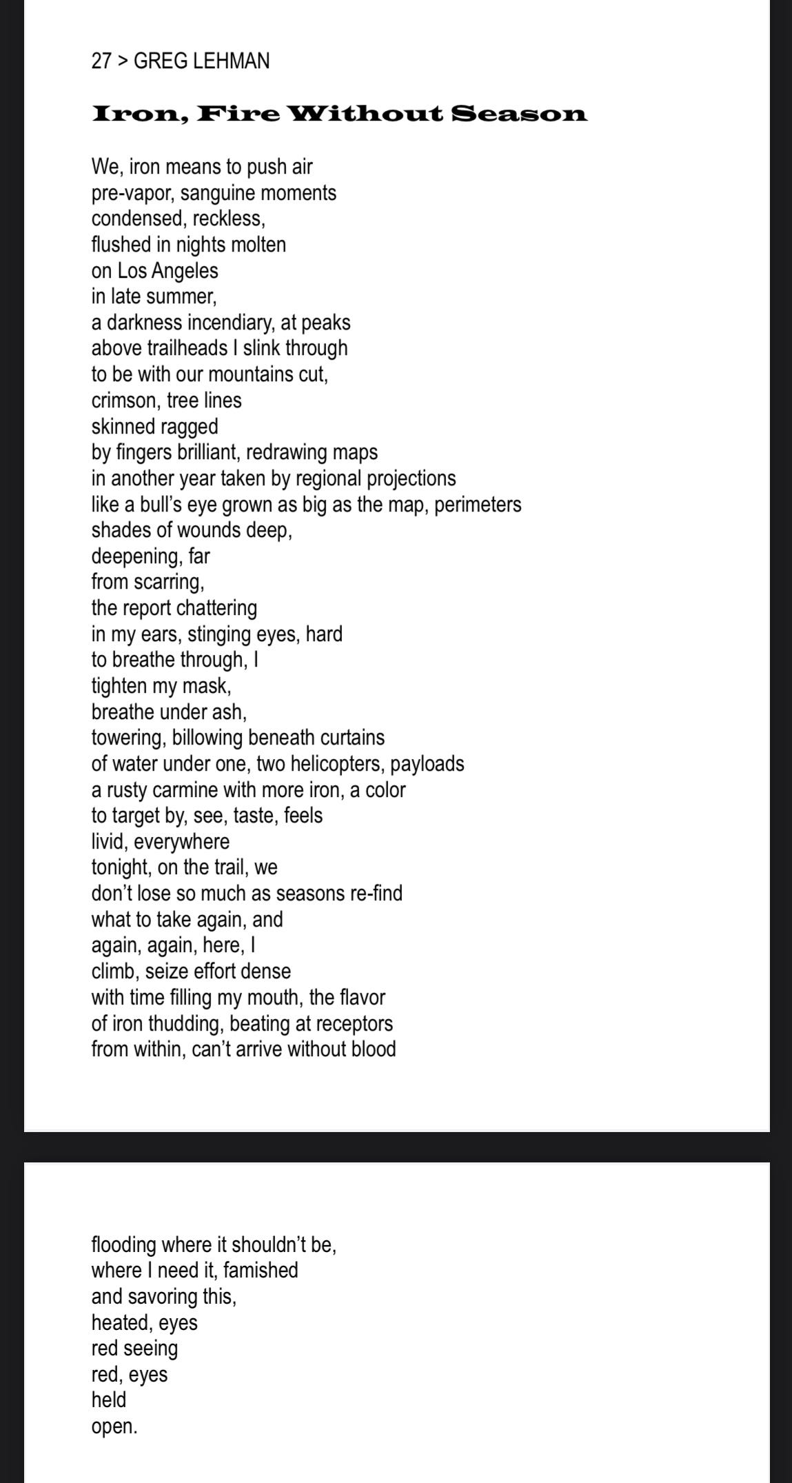 The tragic losses of the fires Los Angeles suffered in 2025, running, biology, resilience, and much more play into this piece, and I’m proud and honored that my creative work continues to find success the more I frame submissions as less a priority than a common routine I enjoy almost every day now.